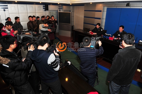 2011年1月5日,泰安市公安局召開第二次新聞發(fā)布會(huì)通報(bào)了1.04持槍殺人案犧牲民警及有關(guān)人員基本情況。圖為發(fā)布會(huì)現(xiàn)場。(攝影 張曉博)