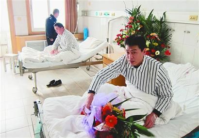 圖二:1月5日,在堵截持槍歹徒戰(zhàn)斗中負(fù)傷的泰安市交警支隊(duì)直屬一大隊(duì)副隊(duì)長(zhǎng)劉峰(右)和中隊(duì)長(zhǎng)趙偉在醫(yī)院治療。 (新華社記者 朱崢 攝)
