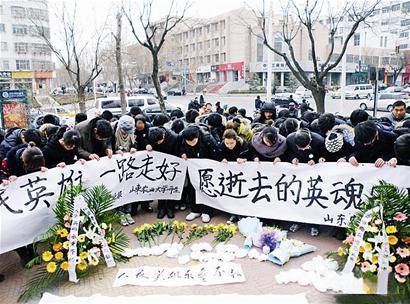 5日下午,200多名大學(xué)生和市民自發(fā)來到案發(fā)現(xiàn)場之一的文化路與龍?zhí)堵方徊媛房,將寄托哀思的條幅放在英雄犧牲的地方,并在寒風(fēng)中深深鞠躬以表哀思,F(xiàn)場的群眾默默地圍在一起,路過的市民也紛紛加入到哀悼的隊伍中。“一鞠躬,向烈士致敬;二鞠躬,向烈士感恩;三鞠躬,烈士一路走好……”一位大學(xué)生站在最前方,帶領(lǐng)現(xiàn)場的群眾集體為烈士三鞠躬。