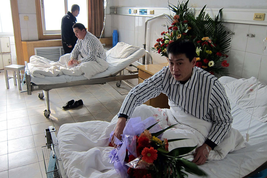 1月5日,在堵截持槍歹徒戰(zhàn)斗中負(fù)傷的泰安市交警支隊(duì)直屬一大隊(duì)副隊(duì)長(zhǎng)劉峰(右)和中隊(duì)長(zhǎng)趙偉在醫(yī)院治療。新華社記者朱崢攝
