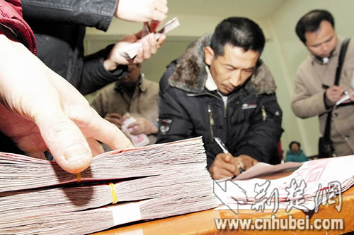 農(nóng)民工們一一簽字認(rèn)領(lǐng)工錢