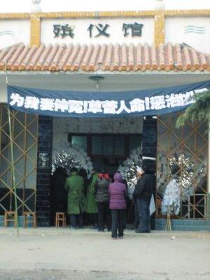 “沒有的事,我們從來(lái)就沒接受這一說(shuō)法!崩罾蛏暗囊幻従訐u頭對(duì)記者說(shuō)。他指著殯儀館門口懸掛的寫有“草菅人命,懲治兇手”等黑色大字的白色橫幅介紹說(shuō):“我們?cè)跉泝x館住了三四天了,就是希望能夠有一個(gè)公道的說(shuō)法,希望能夠懲治兇手,告慰死者!