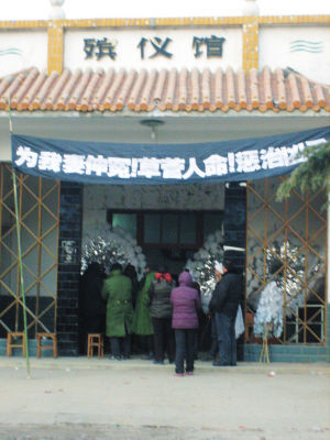 “沒有的事,我們從來就沒接受這一說法。”李莉生前的一名鄰居搖頭對記者說。他指著殯儀館門口懸掛的寫有“草菅人命,懲治兇手”等黑色大字的白色橫幅介紹說:“我們在殯儀館住了三四天了,就是希望能夠有一個公道的說法,希望能夠懲治兇手,告慰死者!