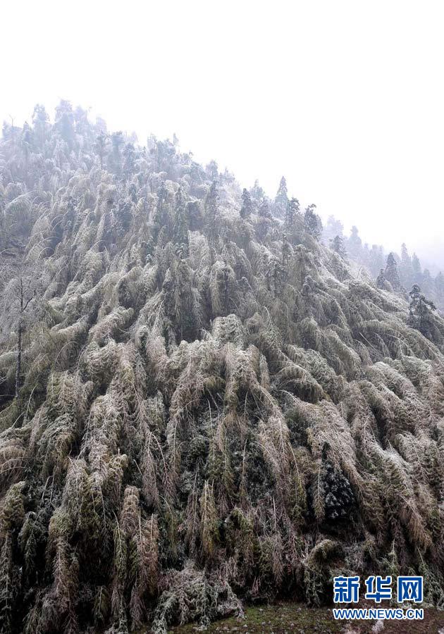 在廣西灌陽縣西山瑤族鄉(xiāng)的一座山上,成片的毛竹結(jié)冰倒伏,部分已開始斷裂(1月8日 陳瑞華 攝)。