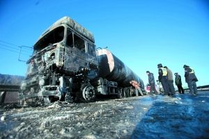 昨日10時(shí)許,京新高速出京方向K88+500米處,一輛裝有柴油的油罐車突然起火,大火燃燒近4小時(shí)后被撲滅,無人員傷亡。現(xiàn)場(chǎng)救援人員分析,罐車后剎車片卡住后,摩擦產(chǎn)生高溫引燃輪胎,而后將罐體燒漏。