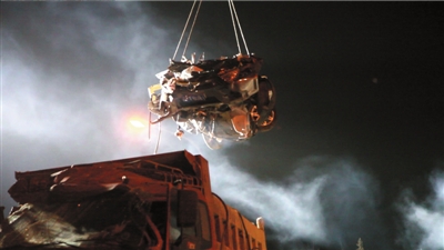 吊車(chē)將被壓得面目全非的轎車(chē)起吊。記者趙恩澤攝