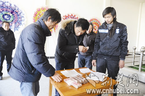 48歲的朱水河是大冶金山店鎮(zhèn)人,1月5日,他最先領(lǐng)取了工錢。他說(shuō),領(lǐng)錢后,他回到老家,前幾天,他和另外已領(lǐng)錢回家的工友商量,雖然錢領(lǐng)了,“不送兩人最后一程心中放不下”,他便和其他3人返回咸寧,盡一份自己的心意。