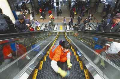 1月19日上午,記者在北京西客站看到,車(chē)站旅客較前幾日明顯增多,但秩序井然。車(chē)站工作人員隨時(shí)待命。圖為一位清潔工正在擦洗電梯,她說(shuō)今年要加班回不了老家。記者 楊登峰 攝