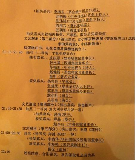 有媒體拍攝了晚宴的詳細(xì)節(jié)目流程。從流程來看,長(zhǎng)達(dá)兩個(gè)多小時(shí)的晚宴共安排了5個(gè)部分的文藝表演,其中袁小海表演了京劇《智取威虎山》的片段、小沈陽(yáng)獻(xiàn)唱了歌曲、姜昆更是現(xiàn)場(chǎng)表演了即將在春晚上演唱的相聲……閻維文、孫曉梅、畢福劍、濮存昕、吳若甫、譚晶、孫楠、趙本山、葛優(yōu)等則分別擔(dān)任了現(xiàn)場(chǎng)各抽獎(jiǎng)環(huán)節(jié)的嘉賓。