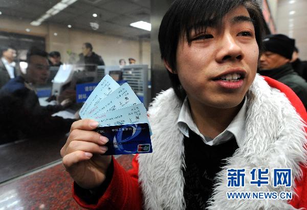 資料圖片:1月17日,一位旅客在南京火車站售票窗口前展示他刷卡購買的車票。新華社記者 孫參 攝