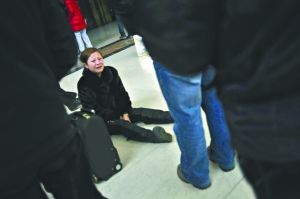 昨日,北京西站,一名女子因?yàn)檎`了火車,還和同行的丈夫走散,無助地坐在地上哭。本報(bào)記者 李強(qiáng) 攝