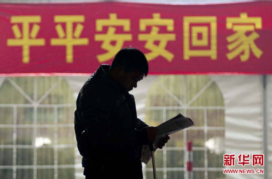 1月19日,一名旅客在浙江杭州城站火車(chē)站臨時(shí)候車(chē)大廳瀏覽報(bào)紙,等候列車(chē)。2011年春運(yùn)自當(dāng)日開(kāi)始至2月27日結(jié)束,為期40天。新華社發(fā)