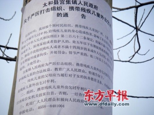 村頭電線桿上措辭激烈的、宣誓將嚴(yán)懲攜帶殘疾兒童出外乞討者的標(biāo)語還反射著鮮艷的墨色,那是前一天才急忙張貼上去的。標(biāo)語的旁邊是措辭更加強(qiáng)烈的宮集鎮(zhèn)政府通告,敦促這些人十日內(nèi)向公安機(jī)關(guān)投案自首,否則嚴(yán)懲,這份通告的落款也是前一天。