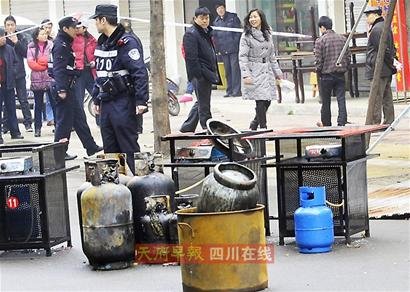 上午9時過,火鍋店內(nèi)的10多個煤氣罐都被拿出來放在了街道中間,警方在外圍拉起了警戒線,嚴(yán)禁圍觀市民吸煙。一位民警提醒同事:“這個罐子還在漏氣,大家要警惕!背啥纪韴笥浾呖拷粺幕疱伒辏吹嚼锩嬉黄墙,焦黑的桌椅板凳、鍋碗瓢盆四處散落,墻上的涂料都被燒干脫落了。