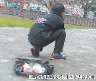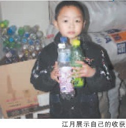 讓江龍海沒有想到的是,2010年2月的一天,兒子江月放學(xué)回來后,興沖沖地跑來告訴他,自己找到一個(gè)幫助父親治病的辦法了。話一說完,江月帶上一個(gè)黑塑料袋離開家門。沒過多久,江月就拎回一塑料袋礦泉水瓶。江月告訴父親,一個(gè)婆婆告訴他,礦泉水瓶也能賣錢,“只要我撿到足夠多的瓶瓶,就能把爸爸的腿醫(yī)好!”