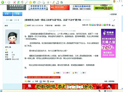 一名在沈海高速如皋服務(wù)區(qū)內(nèi)做保潔的女工,深夜撿到一個(gè)錢(qián)包后沒(méi)有上交,而是帶回家。根據(jù)監(jiān)控錄像,交警帶著失主找到清潔工后,清潔工將裝有近2萬(wàn)元現(xiàn)金和重要證件的錢(qián)包交還失主,并謝絕了酬謝。但此后,這名清潔工所在單位卻以“還款不及時(shí)”為由,將其開(kāi)除。該女工感覺(jué)自己很冤,“好事難道做不得?”而服務(wù)區(qū)相關(guān)人士則稱是按規(guī)定辦事。孰是孰非,雙方各執(zhí)一詞,并在當(dāng)?shù)匾l(fā)眾多議論。