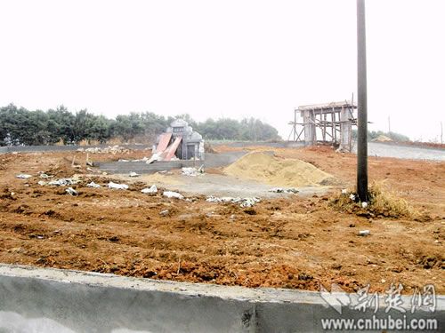 27日,記者在現(xiàn)場看到,該墓地建在一村級公路旁的山坡上,大體呈橢圓形,遠遠望去十分壯觀。墓地還未完工,但門樓已建成,土地已平整(如圖)。據(jù)墓地的一名看護人員稱,墓地占地面積一畝多,是在外地做生意發(fā)財?shù)挠嗄碁楦改附ㄔ斓。該墓地還占用了緊鄰的壽橋村1組的土地約0.4畝,這塊地還是用12組的土地與1組交換來的。墓地承包給一個包工頭,具體建筑費用不詳。