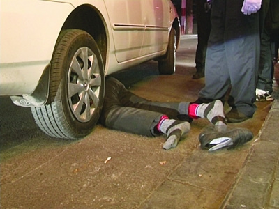 昨晨零時,記者接到市民報料,反映在南京市白下區(qū)明瓦廊一飯店門口,一女子駕車時,右前輪意外碾過一名橫臥街頭的男子,女子停車后發(fā)現(xiàn)男子被卡在轎車下無法動彈,現(xiàn)在大家正在想辦法怎么把車下的人救出來。