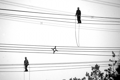 2月25日晨,記者來到三峽大壩附近的4號高壓鐵塔。4號高塔位于秭歸山區(qū),站在山頭遠遠可看見三峽地下電站。沒一會,就迎來從山里走出的“空中來客”。高壓塔上共有6相導(dǎo)線,每相導(dǎo)線上均有一名巡線工。高壓線離地有近4層樓高,線上的6名巡線工抓著兩股高壓線,腰間系著保險繩,踩著高壓線一步步向前挪動。有時,巡線工會停下來,拿出紙筆不時紀錄,有時巡線工則拿出相機,對著線下拍攝。