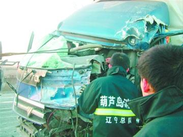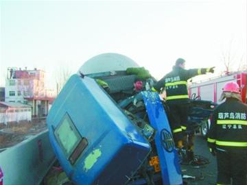 接警后,綏中消防大隊(duì)迅速出動泡沫車、搶險(xiǎn)救援車、水罐車趕往現(xiàn)場。經(jīng)偵查,罐車駕駛室被撞得粉碎,駕駛員雙腿被儀表盤和座椅卡住,另一名被困者在駕駛室后側(cè)臥鋪上,全身被駕駛室的鐵皮包裹,只露出頭部和一只腳。經(jīng)檢測,此時(shí)罐體沒有發(fā)生泄漏。相撞的小型廂式貨車駕駛室左側(cè)被撞癟,駕駛員身上多處被撞傷,雙腿被卡住,而且貨車油箱發(fā)生泄漏,流出的柴油如遇火源,極易引發(fā)二次險(xiǎn)情。