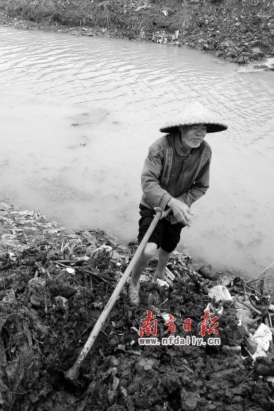 2月26日,雷州東洋灌區(qū),城內(nèi)電灌一站旁,開闊的農(nóng)田中,鄉(xiāng)親們正在為春耕忙碌。頭戴蓑帽、68歲的何世振赤腳踩在污泥和垃圾充塞的河道里,一腳深一腳淺地將被掩埋的排水管挖開。