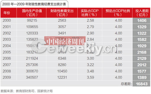 根據(jù)教育部財務(wù)司、《中國統(tǒng)計年鑒2009》及國家統(tǒng)計局公布的數(shù)據(jù)計算,從2000年到2009年10年間,以4%的比例為目標(biāo),則國家財政性教育經(jīng)費支出10年累計“欠賬”已達16843億元。2002年到2003年間,經(jīng)費投入甚至還出現(xiàn)了0.06%的倒退。截至2009年,國家財政性教育支出12231.09億元,占國民生產(chǎn)總值的3.59%。