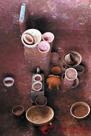 該處發(fā)現(xiàn)的東漢墓葬有11座之多,包括磚室墓和豎穴木槨墓兩種,多數(shù)保存完好,隨葬器物豐富。去年底發(fā)現(xiàn)的東漢前期磚木合構(gòu)墓,隨葬器物達111件套,是廣州考古發(fā)現(xiàn)規(guī)模最大、結(jié)構(gòu)最完整的東漢墓之一。