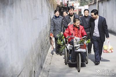 昨日上午,溫暖的陽光灑在漢口球場(chǎng)路的一個(gè)小巷里。一輛輪椅邊圍滿了人,大家有說有笑,場(chǎng)面十分溫馨(如圖)。