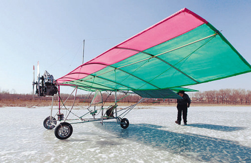 今天的第一次試飛便成功了,丁師傅興奮地告訴記者,“別看這架飛機很簡易,可我不僅能飛離地面,還能控制它飛行的方向”。足球場大小的湖面上,未開化的冰面成了飛行跑道,丁師傅開足馬達,起動、加速、起飛,整個動作也顯得連貫了許多。待飛機徐徐升起到4-5米的高度,為了安全起見便不再升高,飛機徐徐滑翔降落,丁師傅盡情享受著在空中輕輕飄飛的美妙感受。