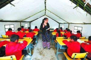 當日,云南省盈江平原鎮(zhèn)崗勐中心小學震后正式復課。在成都軍區(qū)某師官兵的援助下,軍用帳篷如期搭建好,四五年級的同學們坐在帳篷教室里朗朗讀書。這次地震使該學校基本被毀,所有教學樓都被震成危房。幸運的是,由于平時經(jīng)常進行逃生演練,學校300多名學生、老師無一受傷。新華社記者 秦晴攝