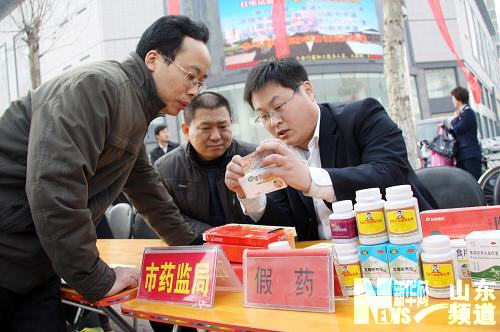 3月13日,山東省聊城市藥監(jiān)部門工作人員在“3·15消費(fèi)者權(quán)益日”宣傳咨詢服務(wù)活動(dòng)現(xiàn)場(chǎng)為市民講解假藥的識(shí)別方法。