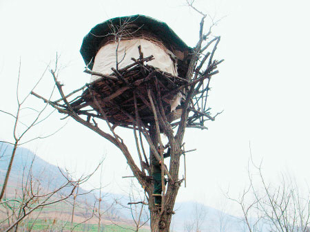 這個(gè)建在樹上的房子位于眉縣湯峪鎮(zhèn)新聯(lián)村下轄的崗子廟村村南,遠(yuǎn)看就像一個(gè)架在樹上的蒙古包。房子的底部是木板,正好利用樹杈自然托起,圓形墻身是用藤條箍的,外面罩了一層塑料布,屋頂上鋪的是油毛氈。村民告訴記者,在這房子中居住的杜仕升及其家人并不是為了看管果園莊稼,就是住在里面生活。