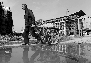 一名建筑工人拉著翻斗車在辦公樓工地前走過。新華社發(fā)