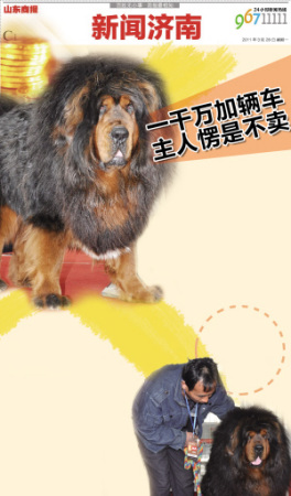 “我出1100萬再加上一輛好車,你把狗賣給我吧!薄安恍,我這藏獒大概價值2000萬呢!”近日,“2011年全國第二屆精品藏獒交易博覽會”在濟南長清區(qū)濱湖大道園博園國際會展中心舉行,全國的頂級藏獒血系以及全國百強獒園率領(lǐng)幼獒軍團集聚山東,其中幾條價值數(shù)千萬的藏獒,更是吸引了眾多養(yǎng)狗愛好者和普通市民的強烈關(guān)注。