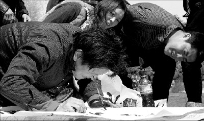 我們擠進(jìn)去,只見一40多歲男子耳孔里夾著一支毛筆正在白紙上寫字,雙眼卻看著一側(cè)的雪松。