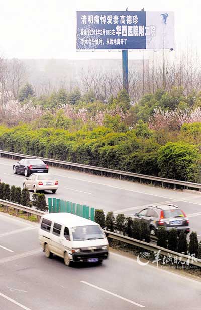 27日22時(shí)32分,新浪認(rèn)證用戶“學(xué)海劉學(xué)!卑l(fā)布微博稱,27日下午約3點(diǎn),一名男子在成溫邛高速公路旁豎立了一幅巨型廣告牌悼念亡妻,內(nèi)容為:“清明痛悼愛(ài)妻高德珍:愛(ài)妻于2011年2月18日在華西醫(yī)院附二院手術(shù)臺(tái)分娩時(shí),永遠(yuǎn)地離開(kāi)了!