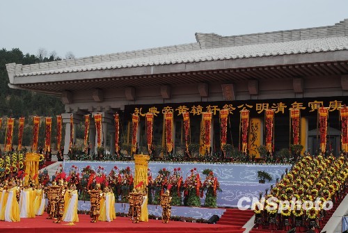 資料圖:2010年(農(nóng)歷庚寅年)清明節(jié),萬(wàn)余名海內(nèi)外華人代表齊聚陜西黃帝陵祭祀大殿前,共同拜祭中華民族的人文始祖軒轅黃帝。圖為4月5日,樂(lè)舞告祭的場(chǎng)景。 中新社發(fā) 冽瑋 攝
