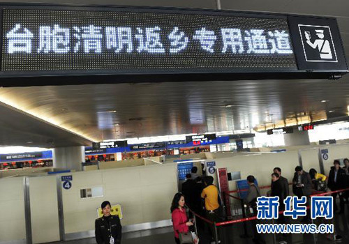 4月1日,旅客在“臺胞清明返鄉(xiāng)專用通道”排隊辦理通關(guān)手續(xù)。(圖片來源:新華網(wǎng))