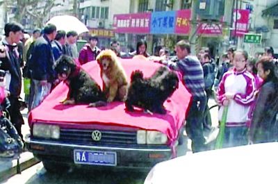 昨天中午12點,記者接到讀者報料趕到現(xiàn)場,發(fā)現(xiàn)長白街和大石壩街交叉路口早圍滿了看熱鬧的市民。一輛青海省西寧市牌照的紅色桑塔納停在路口,車頂上鋪了一層紅色布?xì)郑?只小“藏獒”被一溜擺放在車頂上。4名男子操著不太地道的普通話,正在賣力地向路人作推銷。