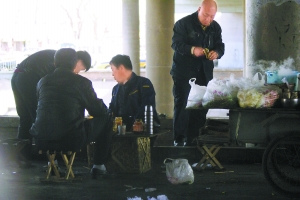 接連三天,記者躲在這片小有名氣的“三輪車餐館”聚集地的周邊觀察,并就餐兩次。這里位于菜戶營橋南約500米的西鐵匠營橋下,幾近干涸的蓮花河從橋下橫穿而過。河道兩岸分散著五六輛三輪車,分屬于五六個“老板”。每輛車的四周放置了幾個竹筐,上面搭層木板,用做桌子,桌邊有小馬扎。