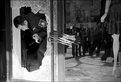 昨天上午,記者在被砸的一家女裝店門前看到,鋼化玻璃門被砸出一個大窟窿,但門上4把鎖未被撬開,門前還留有幾塊碎裂的磚頭,地面上布滿了鋼化玻璃碎片。為了保護(hù)現(xiàn)場,店內(nèi)工作人員從被砸出的窟窿進(jìn)出。其余3家店則均只上了一把鎖,全被撬壞。據(jù)了解,4家店丟失的財物包括一臺價值3000多元的數(shù)碼相機(jī)和5000多元現(xiàn)金。