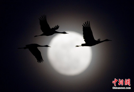 資料圖:2011年3月18日,美國內(nèi)布拉斯加州,沙丘鶴飛過升起的月亮。美國航空航天局發(fā)布消息說,19日,月球?qū)⒌竭_19年來距離地球最近位置,它與地球的距離僅有35萬多公里,從地球上觀看,月球比遠地點時面積增大14%,亮度增加30%,號稱“超級月亮”。