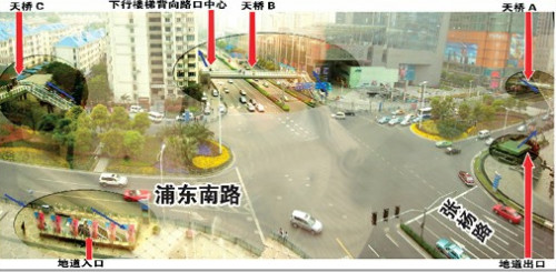 俯瞰浦東南路張楊路路口,周邊商場(chǎng)林立,3座天橋,一條地道獨(dú)立分布,行人斜穿路口需要爬2座天橋,且其中一座的下行樓梯背向路口中心。