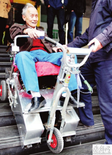記者看到這輛電動(dòng)多功能上下樓梯車長約1.2米,寬約0.8米,主要由輪椅和履帶組成,就像一張殘疾人坐椅搭在了一袖珍坦克的履帶上。正在演示的老人叫張瑞鈞,是一名83歲的老科技工作者。他告訴記者:“發(fā)明這輛輪椅花了十多年,幾經(jīng)改進(jìn)才研制成功,還取得了國家專利!睋(jù)了解,當(dāng)年張瑞鈞因?yàn)橐晃粴埣才笥焉舷聵翘荻家咳吮,自己痛苦,別人費(fèi)勁,這才觸動(dòng)他研發(fā)上下樓梯代步工具,他說,殘疾人朋友有了這種車,這一難題將會(huì)迎刃而解。