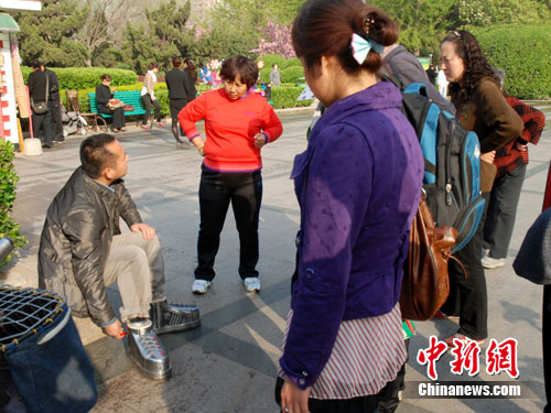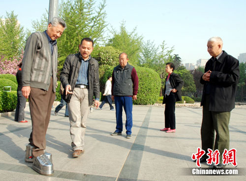 晨練者圍觀袁徽腳上的鐵鞋。中新網(wǎng)記者 門杰丹 攝