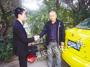 失主夏雙明(左)提著失而復(fù)得的電腦包,握著譚師傅連聲稱謝