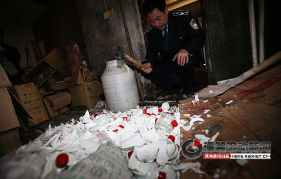 昨日,長沙東岸鄉(xiāng)杉木村,一個制售假劣名酒的黑窩點查獲現(xiàn)場,讓人觸目驚心。