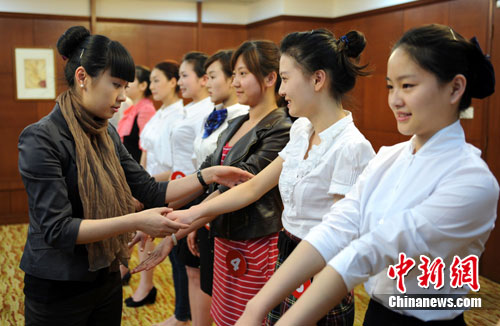 4月18日,重慶一空乘招聘現(xiàn)場,考官查看準“空姐”們的手臂。曹多然 攝