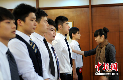白襯衣、黑皮鞋、職業(yè)微笑,招聘現(xiàn)場,300多名準“空姐空少”們一身職業(yè)裝束,還不時對著鏡子練習站姿和“八顆牙微笑”。