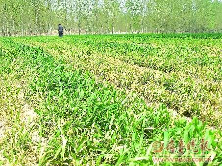 在莘縣董杜莊鎮(zhèn),澆過(guò)污水的小麥漸漸變黃死掉。 本報(bào)記者 劉彥朋 攝